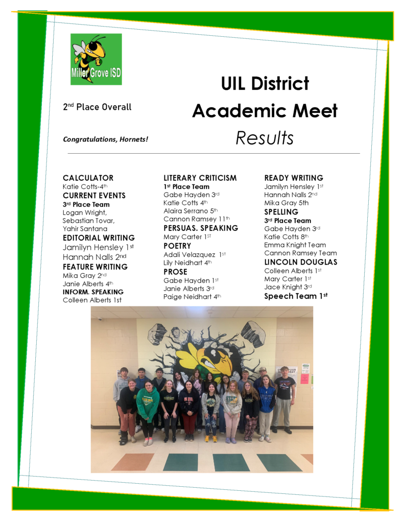 UIL District Academic Meet results posted April 11, 2024 administrator Congratulations Hornets! UIL District Academic Meet results posted.